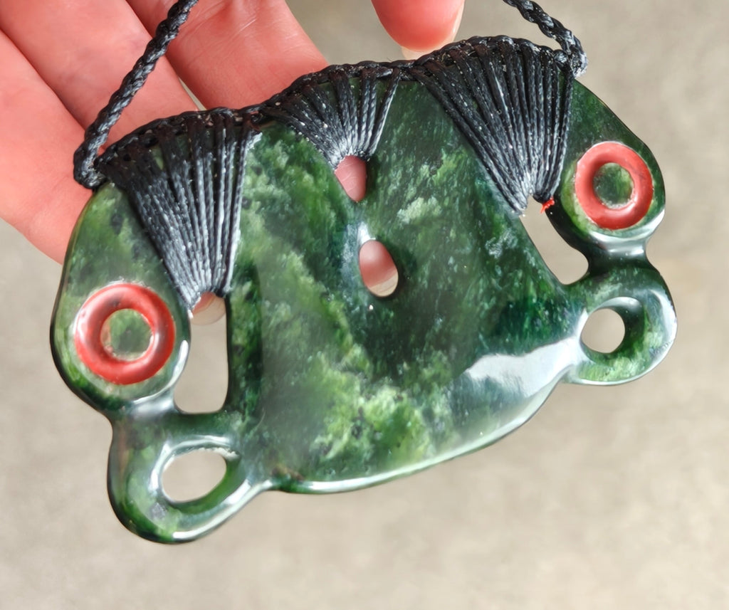 The name Pekapeka comes from the native bat of Aotearoa. With eyes in both the physical and spiritual realms, the Pekapeka is a formidable kaitiaki (protector). Worn on special occasions, it is carved as twin outward facing manaia (guardians) connected by a single body.