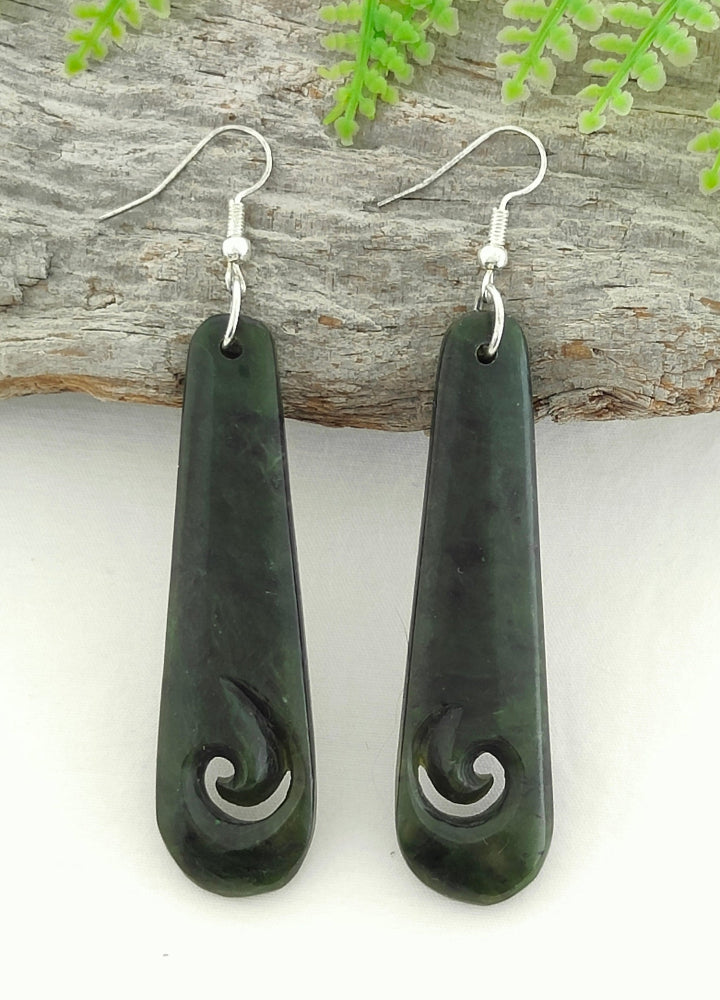 NZ Greenstone Drop Koru Earrings 62mm #62B