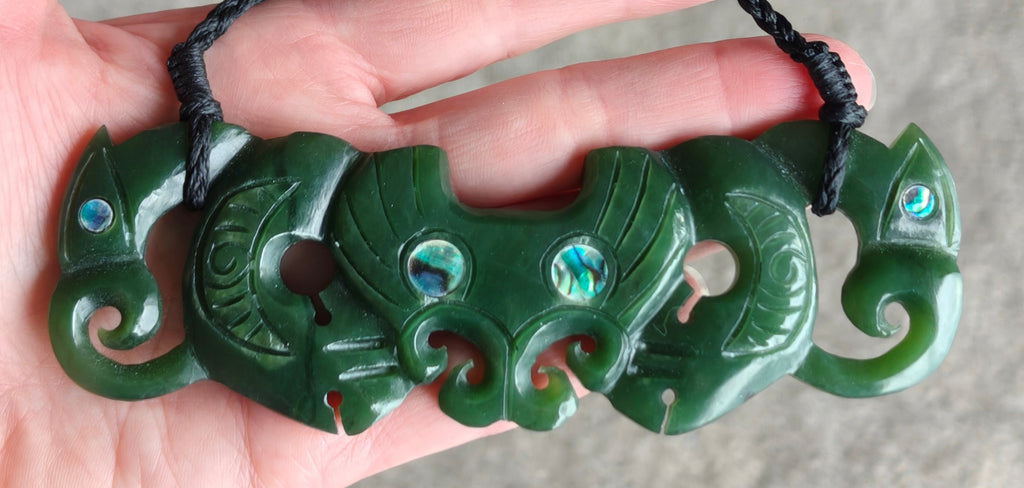 NZ Greenstone Double Sided Manaia Pendant With Paua Eyes.