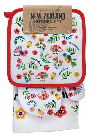 Brighten up your kitchen textile collection with our unique NZ themed Tea Towel and Oven Glove Set.