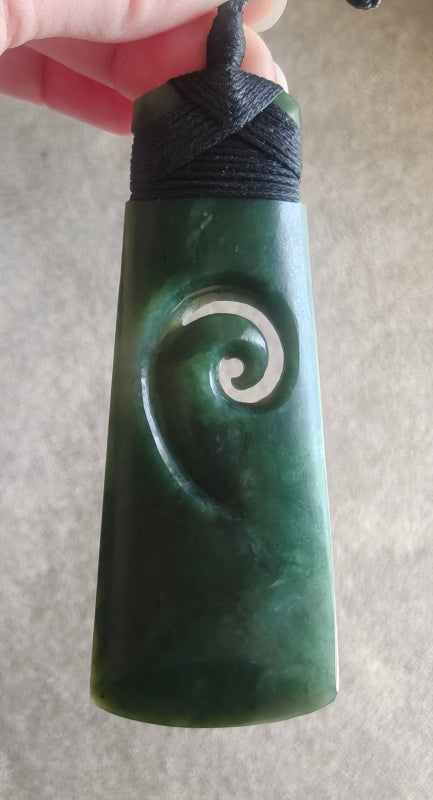 Measurements: Approx: 89mm x 35mm, 8mm thick Comes with black adjustable slipknot cord, Kete Bag and its Meaning. Carved in New Zealand using genuine New Zealand Greenstone from the West Coast of the South Island. Greenstone Meanings: Adze/Toki: Signifies strength, control, personal growth. Koru: Personal growth, harmony, positive change, new beginnings....